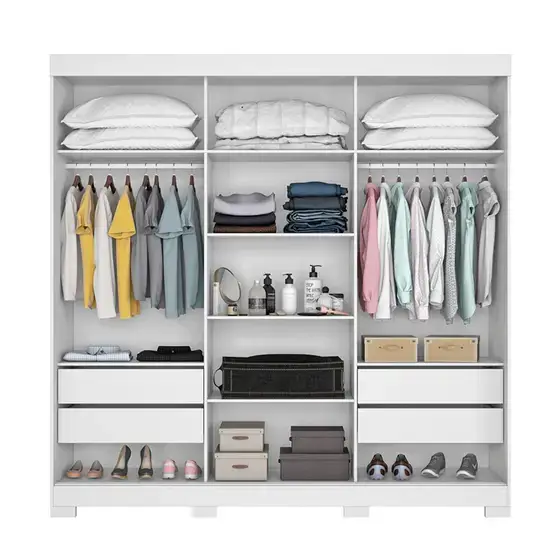 deslizantes, cabideiros em alumínio, quatro gavetas internas com corrediças telescópicas e muito, mas muito espaço para você organizar