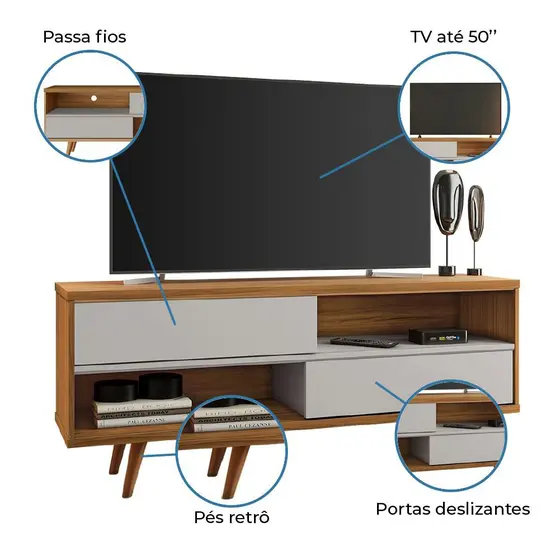 DIFERENCIAL: PÉS RETRÔ, NICHOS ESPAÇOSOS, PORTAS DESLIZANTES, ESPAÇOS PARA ELETRÔNICOS, PRODUTO COMPACTO