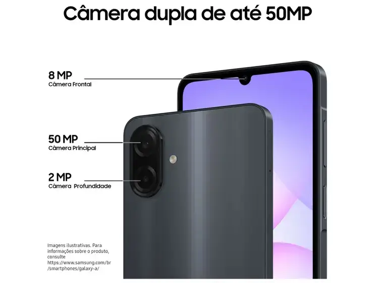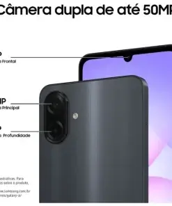 O Samsung Galaxy A07 é a escolha perfeita para quem busca performance, uma bateria incrível e câmeras de alta qualidade. Desenhado para o seu dia a dia, ele combina um design moderno com todos os recursos que você precisa para se conectar, criar e se divertir. Viva com mais liberdade e menos preocupação com a tomada. Com uma poderosa bateria de 5000mAh, o Galaxy A07 tem energia de sobra para um dia inteiro de uso intenso, seja para maratonar séries, jogar ou navegar nas redes sociais. E quando precisar recarregar, o Carregamento Rápido de 25W garante que você volte à ação em pouco tempo. Capture o mundo com detalhes impressionantes. A câmera traseira dupla, com um sensor principal de 50MP, permite tirar fotos nítidas e ricas em cores. Seja um retrato, uma paisagem ou um momento especial, seus registros terão qualidade surpreendente. A câmera frontal de 8MP garante selfies perfeitas para compartilhar. Desempenho ágil para todas as suas tarefas. O processador Octa-Core, combinado com a tecnologia RAM Plus que otimiza a memória RAM, garante uma experiência fluida ao alternar entre aplicativos. E com 128GB de armazenamento interno, você terá espaço de sobra para guardar todas as suas fotos, vídeos e apps favoritos sem se preocupar. Mergulhe em seus conteúdos na ampla tela de 6.7 polegadas, que oferece uma visualização imersiva para vídeos e jogos. Feito para o dia a dia, o Galaxy A07 ainda conta com certificação IP54, oferecendo resistência contra poeira e respingos d’água para sua tranquilidade. É a combinação ideal de estilo, potência e autonomia.