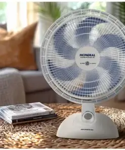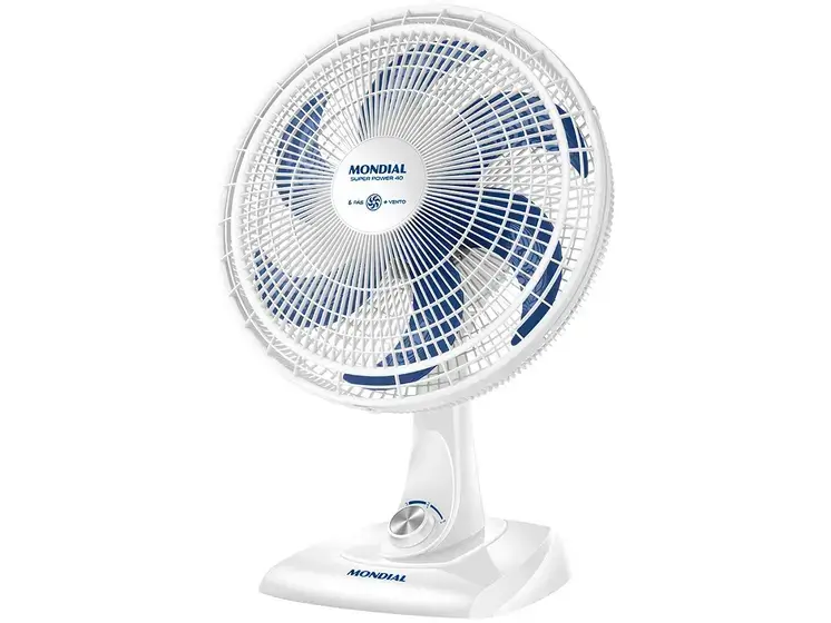 O Ventilador de Mesa Mondial Super Power VSP-40-W, na cor branca e azul, é uma opção pra deixar o ambiente mais fresco e arejado. Ele tem 6 pás e 40cm de diâmetro. Com uma potência de 140W, a hélice tem um design aerodinâmico que busca uma maior vazão do ar, o que proporciona um vento forte , tornando o ambiente fresco e arejado. O aparelho é feito para ser silencioso, o que contribui para o bem-estar da família, permitindo conversar tranquilamente e assistir TV. O ventilador possui 3 velocidades (máxima turbo, média conforto, mínima silencioso) que permitem adequar o nível de ventilação à sua necessidade. O sistema oscilante ajuda a distribuir o ar pelo ambiente, deixando-o mais agradável. A inclinação vertical é regulável, o que permite direcionar o fluxo do ar.